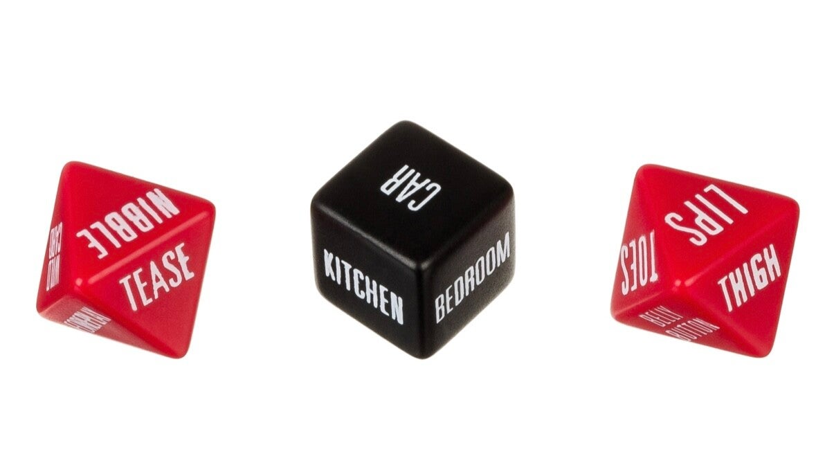 - 3 dés à jouer pour une nuit de plaisir. Lancez les dés pour déterminer la partie du corps, l'activité et la localisation